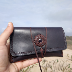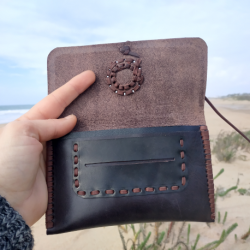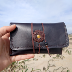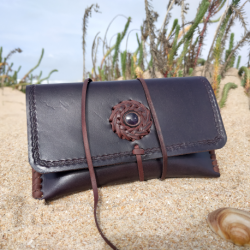 Funda para tabaco de liar hecha con piel de vaca y caballo de maxima calidad de origen español, decorada con una piedra mineral circular en la tapadera, tiene dos compartimentos grandes para tabaco y boquillas y un apartado para el papel.