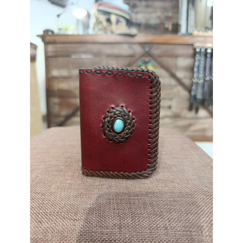 Cartera de cuero hecha a mano con piel de ternera de calidad premiun de origen español, decorada con piedra turquesa engarzado.